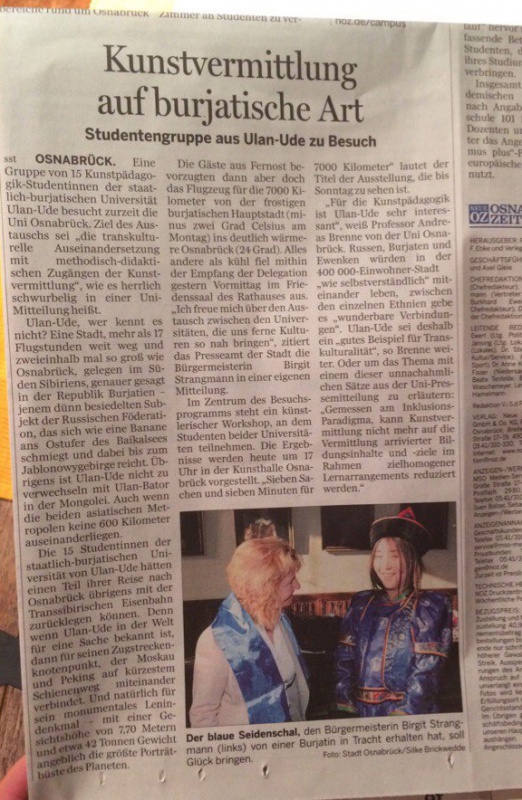 Основным мероприятием реализуемого проекта являлась совместная выставка творческих работ студентов Бурятского государственного университета и Университета Оснабрюк в «Кунстхалле Оснабрюк». Среди студенческих экспонатов нашей группы на выставке были представлены изделия из дерева (шкатулки, разделочные доски, ложки), расписанные по мотивам известных народных художественных промыслов (Хохлома, Городец), традиционные костюмы русского и бурятского народов, эвенкийские обереги «дылачакан», модели войлочной и деревянной юрт, бурятская народная игра в кости «Шагай наадан», сувенирные куклы в национальном стиле, живописные работы, авторские фотографии природы родного края, поделки в технике мыловарения, декоративные тарелки и панно. Представленные на выставке работы получили высокую оценку зрителей, которые впервые узнали о республике у Байкала, традициях проживающих в ней народов.