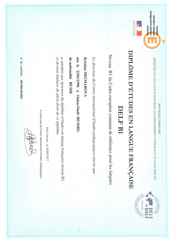 Поздравляем студентов ИФМК Сахияеву Анастасию, Мигмарову Кристину, Цырендашиеву Алину, Цыремпилову Надежду, Немилову Екатерину, Дрягилеву Анну, Мокееву Марию с получением французского диплома ДЕЛФ! Желаем дальнейших учпехов в изучении французского языка!