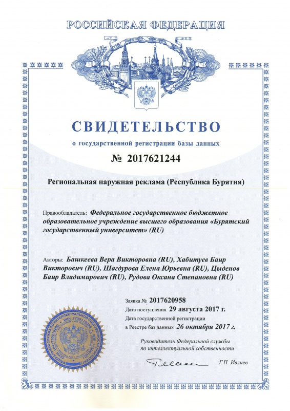 Поздравляем авторов - д.филол.н., проф. Башкееву В.В., ст. преп. Хабитуева Б.В., Шагдурову Е.Ю., Цыденова Б.В., Рудову О.С. с получением свидетельства о государственной регистрации базы данных "Региональная наружная реклама (Республика Бурятия)" № 2017621244. База данных содержит информацию о региональной наружной рекламе Республики Бурятия (2015 - 2016 годы). База данных будет использована в качестве закрытого веб-ресурса для исследовательской работы, маркетингового анализа специалистов соответствующего научного направления или сектора экономики.