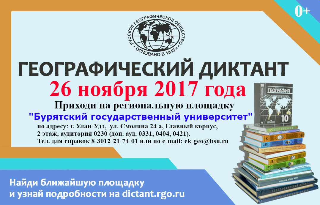 26 ноября 2017 г. на базе региональной площадки Бурятского государственного университета будет проводиться Ежегодная международная образовательная акция "Географический диктант".
