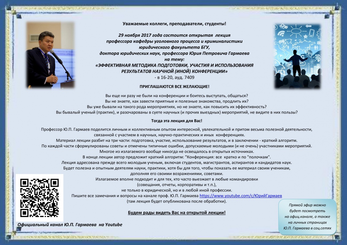Профессор Ю.П. Гармаев поделится личным и коллективным опытом интересной, увлекательной и притом весьма полезной деятельности, связанной с участием в научных, научно-практических и иных конференциях.