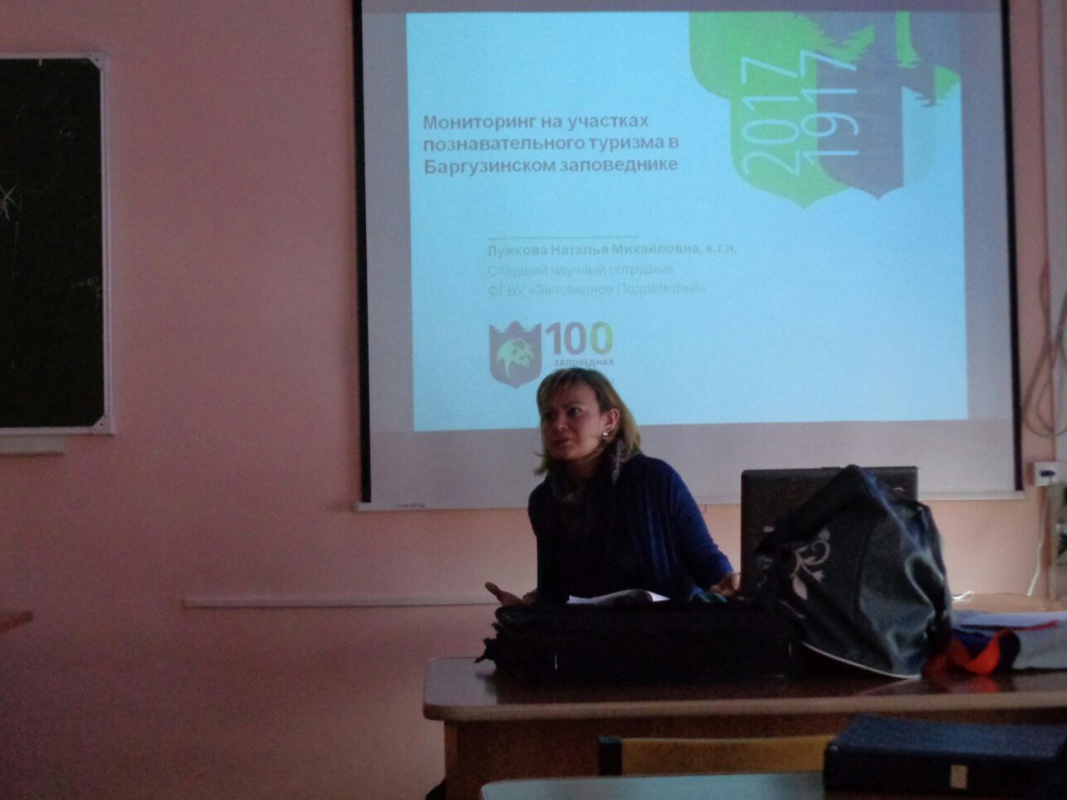 22 ноября прошла ежегодная встреча с сотрудниками Баргузинского государственного природного биосферного заповедника (заместитель директора по научной работе, д.б.н. Александр Афанасьевич Ананин, к.б.н., с.н.с. Евгения Васильевна Бухарова, к.г.н., с.н.с. Наталья Михайловна Лужкова, с.н.с. Вадим Михайлович Козулин). Тема семинара в этом году была озвучена: «Летопись природы и мониторинг компонентов живой природы в Баргузинском заповеднике». Сотрудники отделов науки и экологического просвещения рассказали о Летописи природы, долгосрочной программе мониторинга, направленная на изучение состояния и динамики естественного хода природных процессов. В рамках этой темы регистрируются природные процессы по многим параметрам. Анализ многолетних данных позволяет делать выводы о динамике процессов в условиях отсутствия антропогенных воздействий.