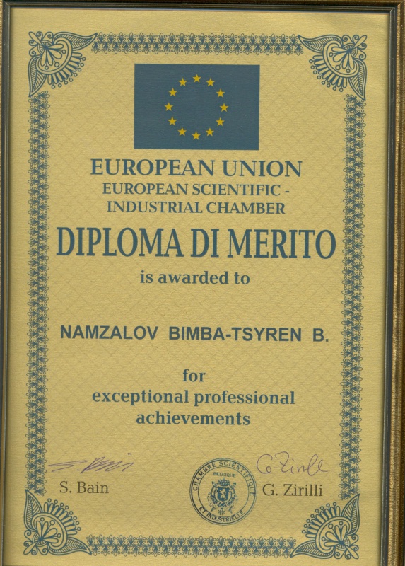 Недавно из Брюсселя пришла радостная новость. Д.б.н., профессор Бимба-Цырен Батомункуевич Намзалов награжден дипломом высшего качества Европейской научно-промышленной палаты (DIPLOMA DI MERITO) за выдающиеся профессиональные достижения.