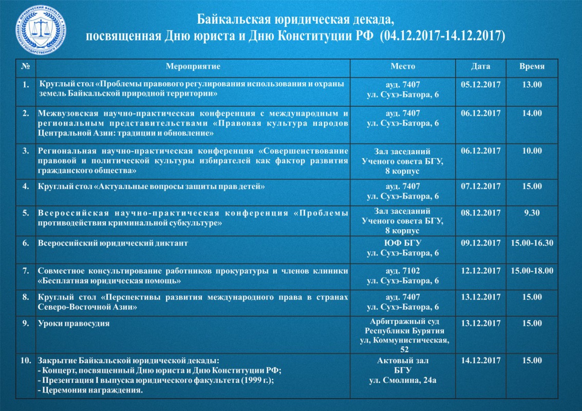 Программа Байкальской юридической декады, посвященной Дню юриста и Дню Конституции (04.12.2017-14.12.2017).