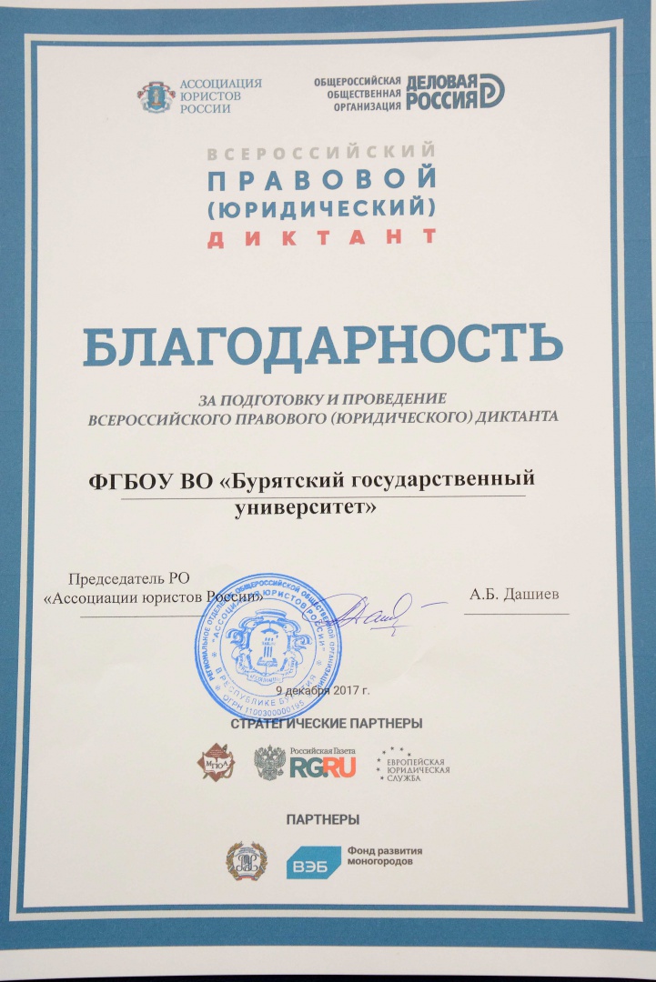 9 декабря 2017 г. в Бурятском государственном университете, как и во всех регионах нашей страны, прошел I Всероссийский юридический диктант. В Бгу в диктанте приняло порядка 80 человек, а всего в республике написали диктант более 300 человек.