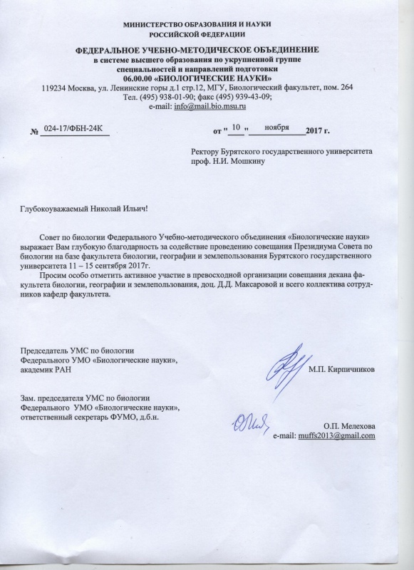 В адрес ректора Бурятского государственного университета Н.И. Мошкина поступило письмо от Совета по биологии Федерального Учебно-методического объединения «Биологические науки» за содействие проведению совещания Президиума Совета по биологии на базе факультета биологии, географии и землепользования Бурятского государственного университета, которое состоялось с 11-15 сентября 2017 г.