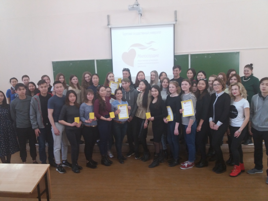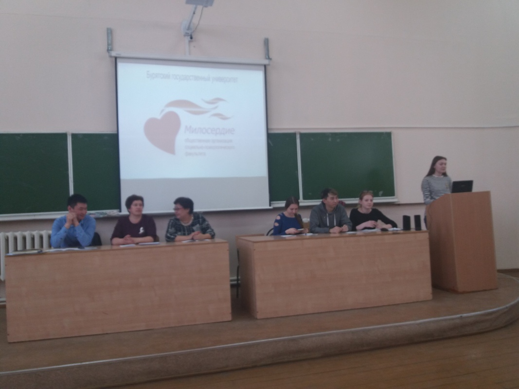 16 апреля 2018 г. в рамках Недели социальной работы в БГУ состоялась отчётная конференция студенческой общественной организации «Милосердие». Почётными гостями конференции стали декан социально-психологического факультета Котоманова О.В., заведующий кафедрой теории социальной работы Антонова Н.С. и основатель «Милосердия», старший специалист по работе с молодежью Министерства спорта и молодёжной политики Республики Бурятия Жигмитдоржиев Б.Д.