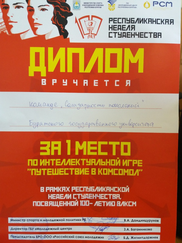 24 апреля в ТРЦ "Пионер" Министерство спорта и молодёжной политики Республики Бурятия, ГБУ "Молодёжный центр РБ" и Бурятское региональное отделение Российского союза молодёжи в рамках республиканской недели студенчества провели интеллектуальную игру "Путешествие в комсомол" среди студентов вузов и ссузов города. Всего в игре приняли участие 9 команд.