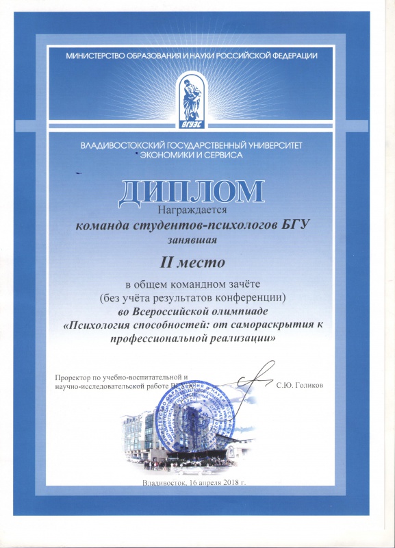 Деканат и преподаватели социально-психологического факультета поздравляют студентов-психологов, занявших II место во Всероссийской олимпиаде по психологии, которая прошла во Владивостоке.