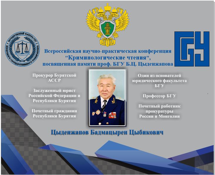 26-27 апреля юридический факультет совместно с Прокуратурой РБ проводит в 13-й раз научно-практическую конференцию «Криминологические чтения». В этом году она посвящена 90-летию со дня рождения одного из основателей юридического факультета, Почетного работника прокуратуры СССР и Монголии, академика Монгольской академии кочевых цивилизаций, почетного профессора университета «Их Засаг», к.ю.н., профессора БГУ Бадмацырена Цыбиковича Цыденжапова.