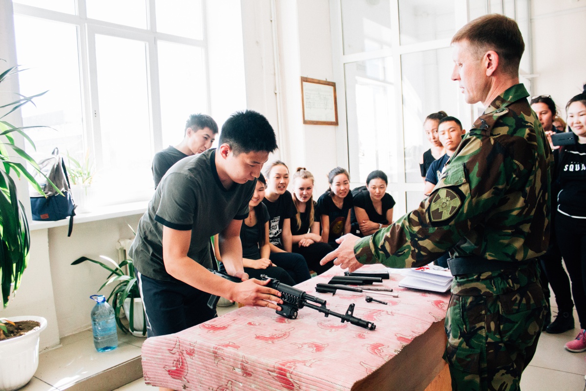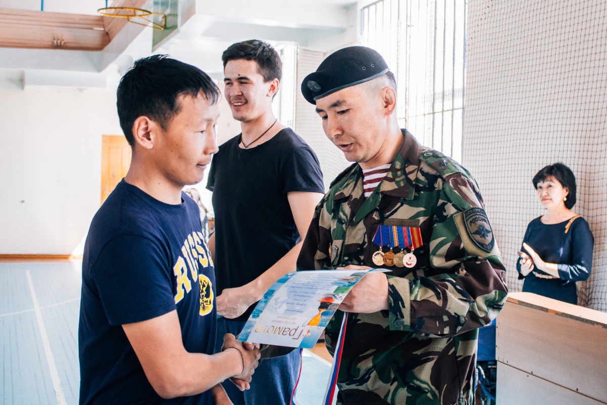 Сотрудники отряда ОМОН поздравили студентов с наступающим днём Победы, подчеркнув значимость проводимого мероприятия. Также во время приветственной речи были награждены студенты, занявшие призовые места в бухэ барилдаан. Награждение провел мастер спорта по вольной борьбе, сотрудник ОМОН Ларионов Е.В.