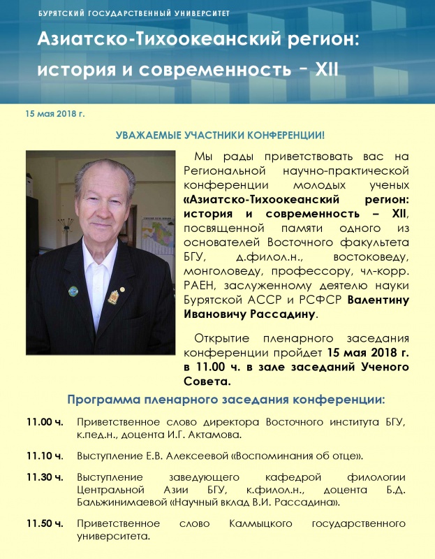 15 мая 2018 г. в 11.00 ч. в Зале заседаний Ученого совета состоится пленарное заседание Региональной научно-практической конференции молодых ученых "Азиатско-Тихоокеанский регион: история и современность - XII", посвященной памяти одного из основателей Восточного факультета БГУ, д.филол.н., востоковеду, монголоведу, профессору, чл-корр. РАЕН, заслуженному деятелю науки Бурятской АССР и РСФСР Валентину Ивановичу Рассадину.