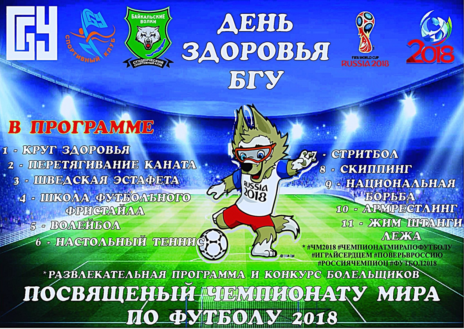 В этом году День Здоровья будет посвящен чемпионату мира по футболу, поэтому в программе праздника планируется речь заслуженного работника физической культуры РБ, мастеру спорта СССР по футболу Сергея Александровича Кокорина, выступление школы футбольного фристайла республики, а также матчевая встреча ветеранов футбола Бурятии с футбольным клубом преподавателей БГУ.