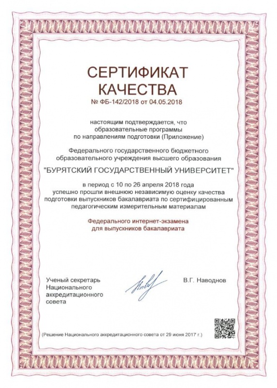 В результате образовательные программы успешно прошли внешнюю независимую оценку качества подготовки выпускников бакалавриата по сертифицированным педагогическим измерительным материалам и получили Сертификат качества № ФБ-142/2018 от 04.05.2018.