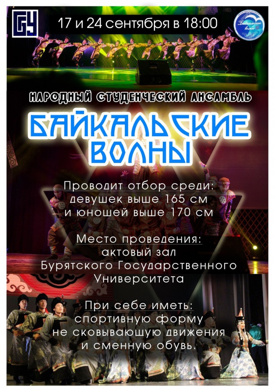 17 и 24 сентября 2018г. в 18:00ч в актовом зале Бурятского государственного университета (главный корпус) состоится отбор в народный студенческий ансамбль "Байкальские волны".