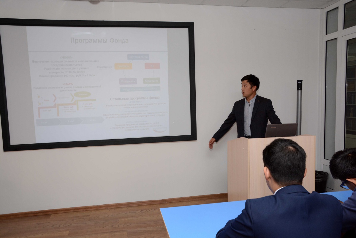 Председатель Совета молодых ученых РБ к. фарм. н. Олег Сергеевич Очиров и научный сотрудник БНЦ, член Совета молодых ученых РБ, к.и.н. Евгений Владимирович Нолев рассказали аспирантам, молодым преподавателям БГУ, а также студентам-старшекурсникам о таких интересных научных проектах, как республиканский конкурс молодежных инновационных проектов по программе «Умник – 2018» и республиканский конкурс «Популярная наука: просто о сложном».