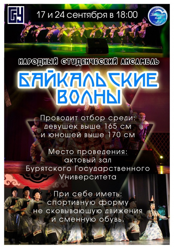 Вниманию первокурсников! Объявлен набор в творческие коллективы университета! История творческих коллективов Бурятского государственного университета началась в далёком 1961 году с открытия народного студенческого ансамбля песни и танца «Байкальские волны». За свою более чем полувековую биографию ансамбль «Байкальские волны» покорял зрителей обширной Российской Федерации, стран Европы и Азии. Творчеству студенческого коллектива рукоплескали жители Швеции, Голландии, Польши, Испании, Португалии, Франции, Венгрии, Китая, Кореи и Монголии.