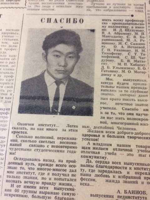В заключении Елаев А. А. – член Правления республиканской общественной организации «Ветераны комсомола Бурятии», который вручил ветеранам комсомола пединститута Осинскому И.И., Баинову А.С., Пыкину В.М., Мантуровой С.Ч. и Доржиевой (Цыденовой) В.Р. благодарственные письма Международного Организационного комитета по подготовке празднования 100-летия ВЛКСМ за подписью его сопредседателей: И. Кобзона, Е.Тяжельникова, Б.Пастухова, В.Мишина – первых секретарей ЦК ВЛКСМ. Благодарности Правления БРО «Ветераны комсомола Бурятии» Бутуханову Л.Д., Бороноеву П.Г., Рогалевой Г.И., Степановой (Жалсараевой) И.Ж.