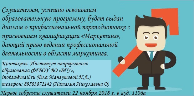 Бурятский государственный университет приглашает тебя получить новую специальность "Маркетинг" дополнительно к основной твоей профессии. Первое собрание слушателей 22 ноября в аудитории 1106а в 17:00 час.