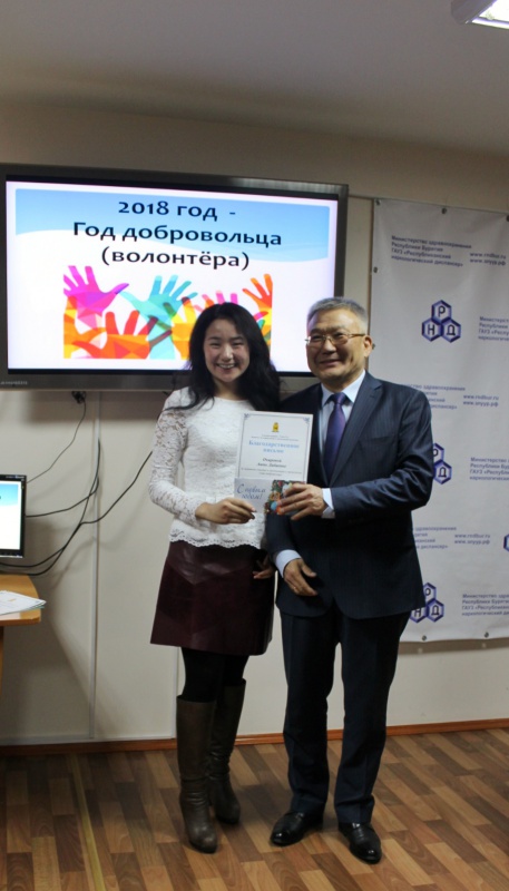 На мероприятие были отмечены благодарностями Министерства здравоохранения РБ за большой вклад в развитие добровольческого движения студенты 5 курса Медицинского института: Алексеев Роман, Гармаев Содном, Николенко Анастасия, Скворцова Наталья, Хромых Юлия, Сынгелова Долгор, Дугаржапова Сэлмэг, Очирова Аюна, Гармаева Марина.