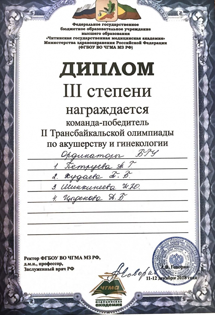 По итогам двухдневного состязания команда ординаторов Медицинского института заняла 3 место на II Трансбайкальской олимпиаде по акушерству и гинекологии, участники команды и руководители команды были награждены медалями.