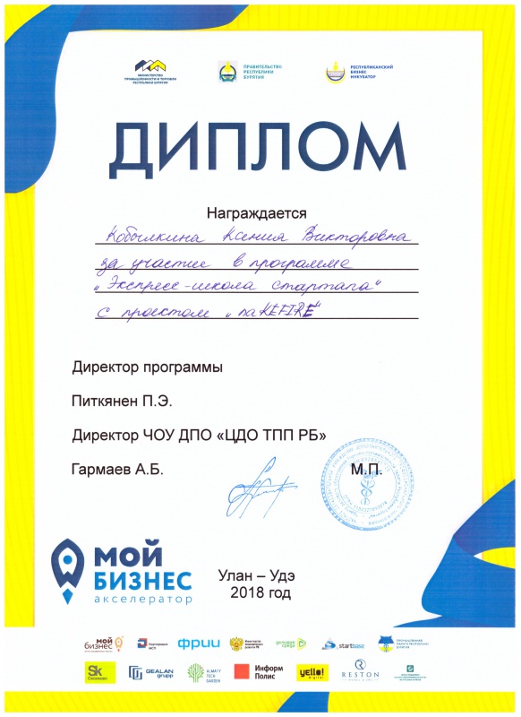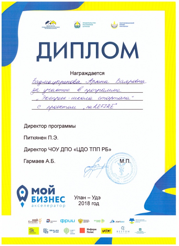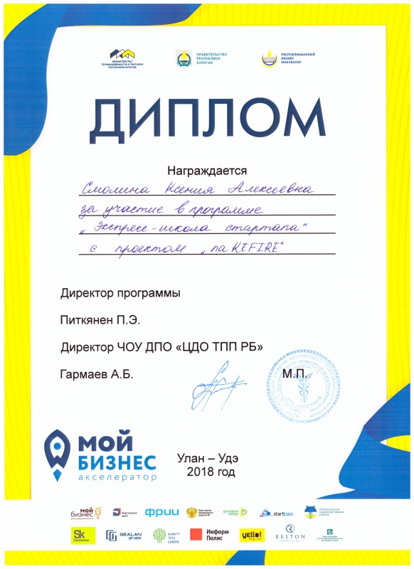 Команда студентов группы 11450 направления «Управление персоналом» ИЭУ БГУ в составе четырёх человек: Норбосамбуевой Бальжит, Смолиной Ксении, Бадмацыреновой Арюны и Кобылкиной Ксении представила свой бизнес-проект «naKEFIRE» и в результате отбора была выбрана для презентации перед инвесторами. Студенты получили бесценный опыт, возможность индивидуального консультирования и помощь в реализации проекта от самого директора программы. Также студентов пригласили на дальнейшие обучения центра предпринимательства «Мой бизнес».