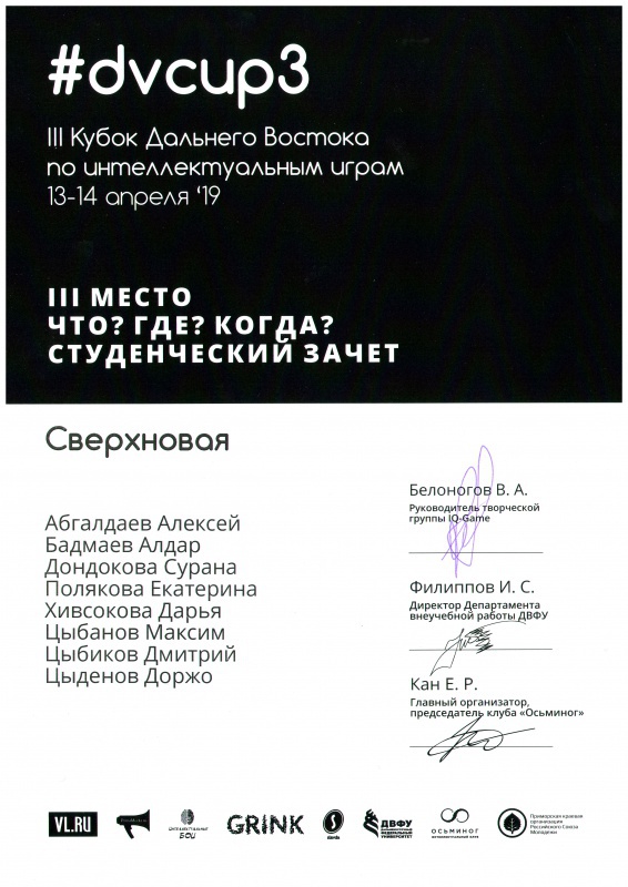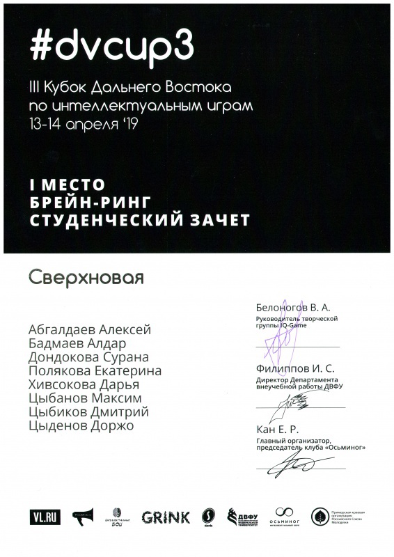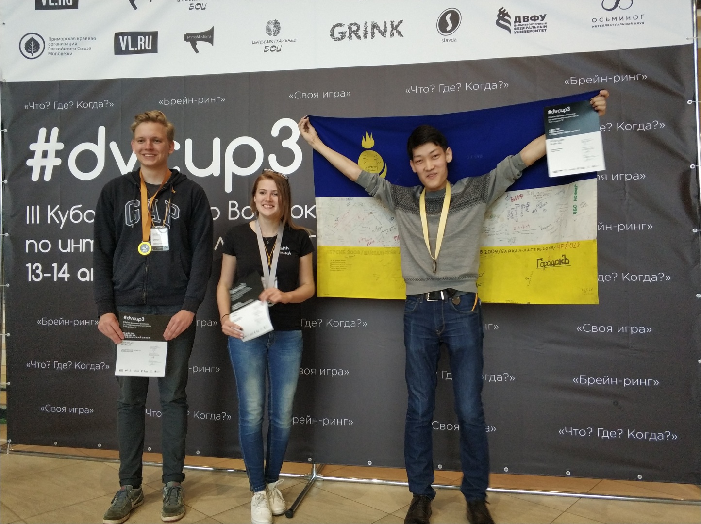 После Первенства Бурятии мы решили объединиться в одну сборную команду и принять участие в Кубке Дальнего Востока (ДВФУ, г. Владивосток). Состав команды получился крайне разносторонний: в ней были представители ИМИ, ВИ, ИФИЯиМК и ЮФ БГУ, а также ВСГИК. Так как поездка во Владивосток - дело довольно затратное, мы попытались найти поддержку у республиканских властей и обратились в Министерство спорта и молодёжной политики, а также в Комитет по молодёжной политике. К сожалению, там нам не смогли помочь, сославшись на отсутствие средств. Посовещавшись друг с другом, мы приняли решение добираться самолётом до Хабаровска, а далее поездом до Владивостока, что занимает сутки в одну сторону (мы не могли ехать на поезде, так как половина игроков команды участвовала в ФИЭБ - Федеральном интернет-экзамене для выпускников бакалавриата).