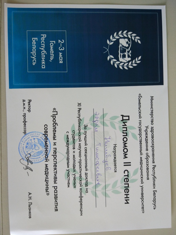 Научно-исследовательская работа из Бурятии получила высокую оценку жюри. Ректор учреждения образования Министерства здравоохранения Республики Беларусь, д.м.н., проф. Лызиков А.Н. вручил студенту 5 курса Нимбуеву Э.Т. диплом 2 степени.