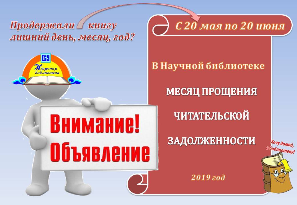 Уважаемые читатели! С 20 мая по 20 июня в Научной библиотеке объявляется «МЕСЯЦ ПРОЩЕНИЯ» читательской задолженности. Читателям задолжникам предоставляется прекрасная возможность сдать книги без пени. Верните книги, не сданные вовремя!