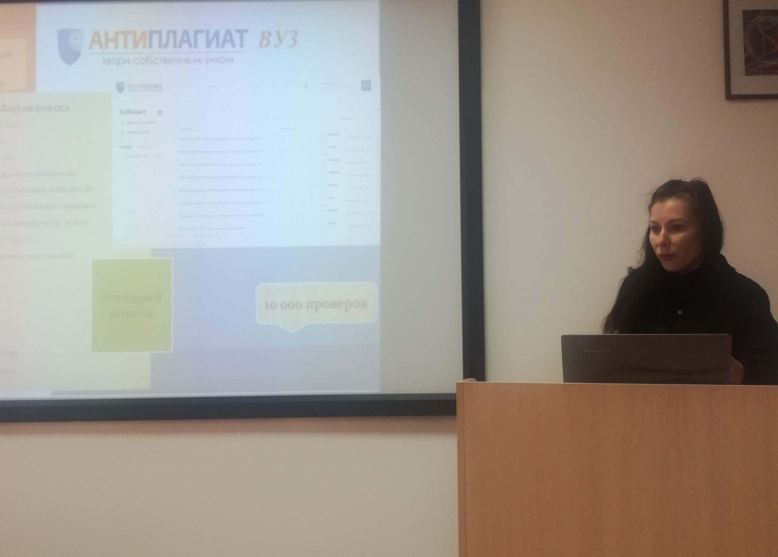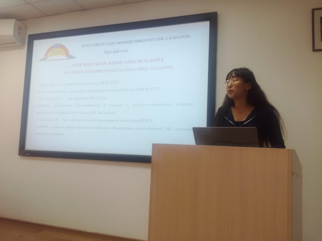 В Научной библиотеке БГУ состоялся Круглый стол «Проблемы обнаружения заимствований в квалификационных работах и научных изданиях». Заседание круглого стола прошло в рамках Методического объединения вузовских библиотек г. Улан-Удэ. Вопрос корректности цитирования и обнаружения заимствований сегодня крайне актуален. Главной темой всех выступлений стал вопрос о проблемах некорректных заимствований в научных текстах, о том, как корректно трактовать результаты проверки, как распознать переводные заимствования и цитаты, как редактировать полный отчет. Формирование экспертной среды для обсуждения проблем и выработки решений стало основной задачей заседания методического объединения.