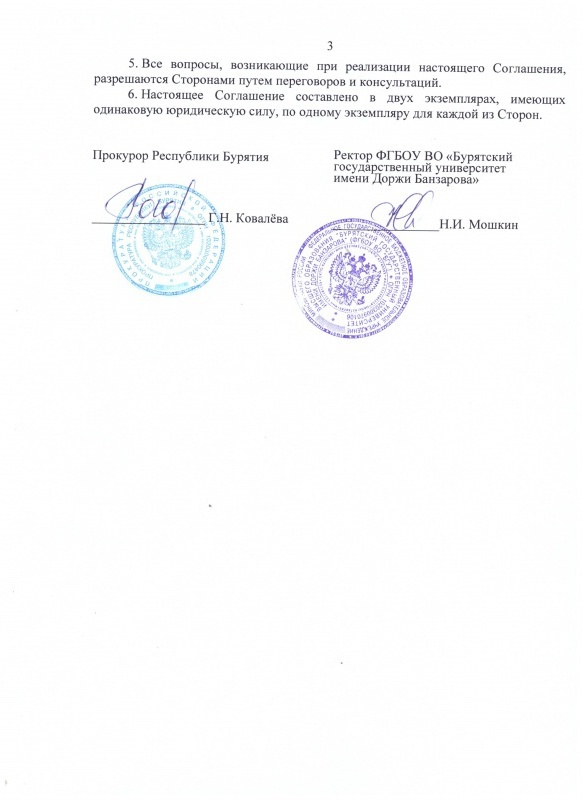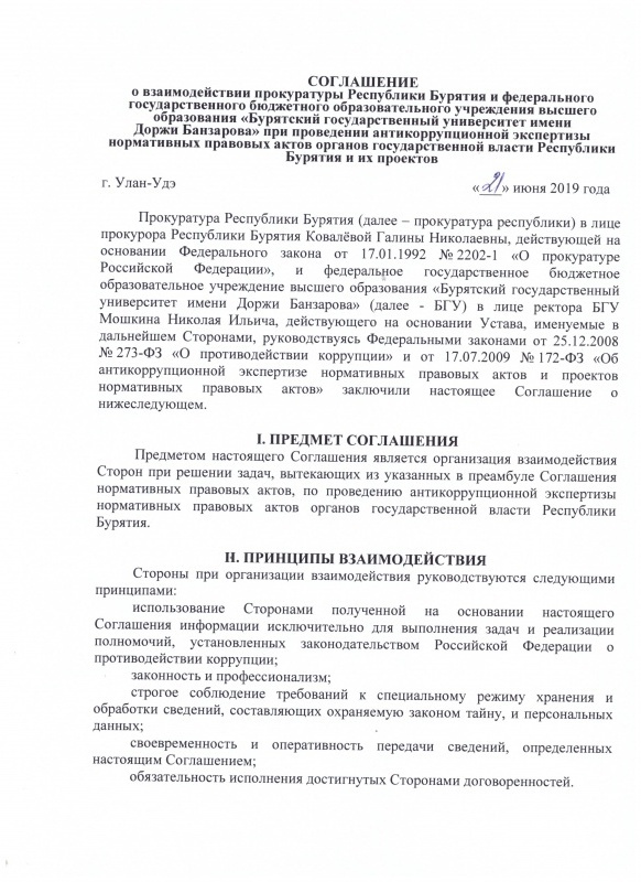 21 июня 2019 между Бурятским государственным университетом им. Д. Банзарова в лице ректора БГУ Николая Ильича Мошкина и Прокуратурой Республики Бурятия в лице прокурора Республики Бурятия Галины Николаевны Ковалёвой подписано Соглашение о взаимодействии при проведении антикоррупционной экспертизы нормативных правовых актов органов государственной власти Республики Бурятия и их проектов.