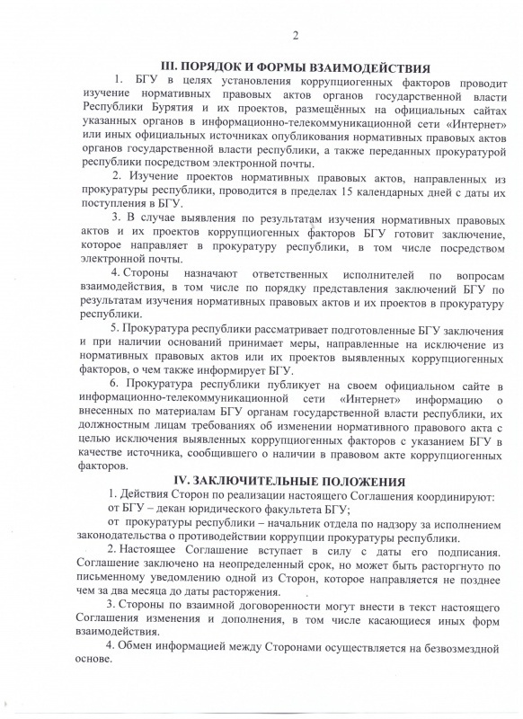 Согласно данному договору, инициированному прокуратурой республики, Бурятский госуниверситет будет проводить в целях установления коррупциогенных факторов изучение нормативных правовых актов органов государственной власти Республики Бурятия и их проектов, размещенных на официальных сайтах указанных органов в информационно-телекоммуникационной сети «Интернет» или иных официальных источниках опубликования нормативных правовых актов органов государственной власти республики, а также переданных прокуратурой республики посредством электронной почты.