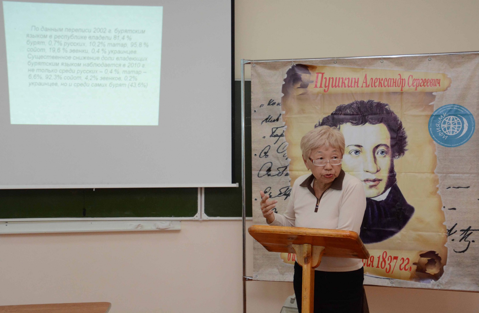 В первой лекции слушатели смогли познакомиться с современной языковой ситуацией Бурятии в социолингвистическом аспекте, с основными тенденциями в языке региона и страны (лектор - д. филол. н., проф., г.н.с. отдела языкознания ИМБиТ СО РАН Дырхеева Галина Александровна).