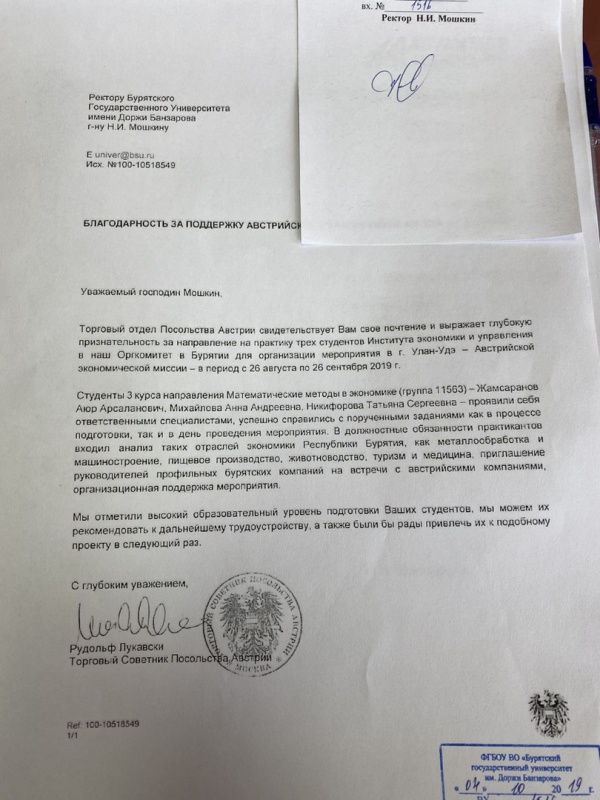 Поздравляем студентов Института экономики и управления 4 курса направления Математические методы в экономике гр.11563 Жамсаранова Аюра, Михайлову Анну и Никифорову Татьяну с успешным прохождением практики в Оргкомитете Австрийской экономической миссии.