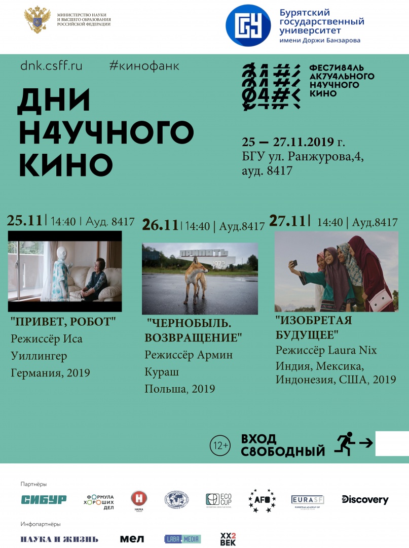 В Бурятском государственном университете Фестиваль актуального научного кино стартовал 25 ноября с фильма "Привет, робот", всего в программе фестиваля 3 интереснейших фильма. Подробное расписание в афише.
