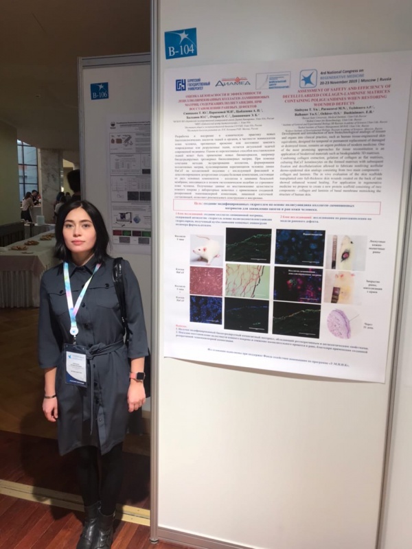 Студентка V курса Медицинского института Синицына Татьяна представила наш университет в постерной сессии с докладом «Оценка безопасности и эффективности децеллюляризованных коллаген-ламининовых матриц, содержащих полигуанидин, при восстановлении раневых дефектов», научный руководитель к.б.н. Цыбденова Арюна Пурбодржиевна.