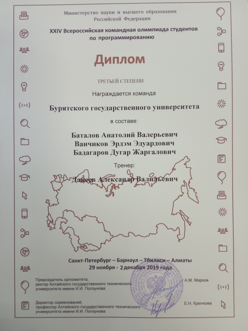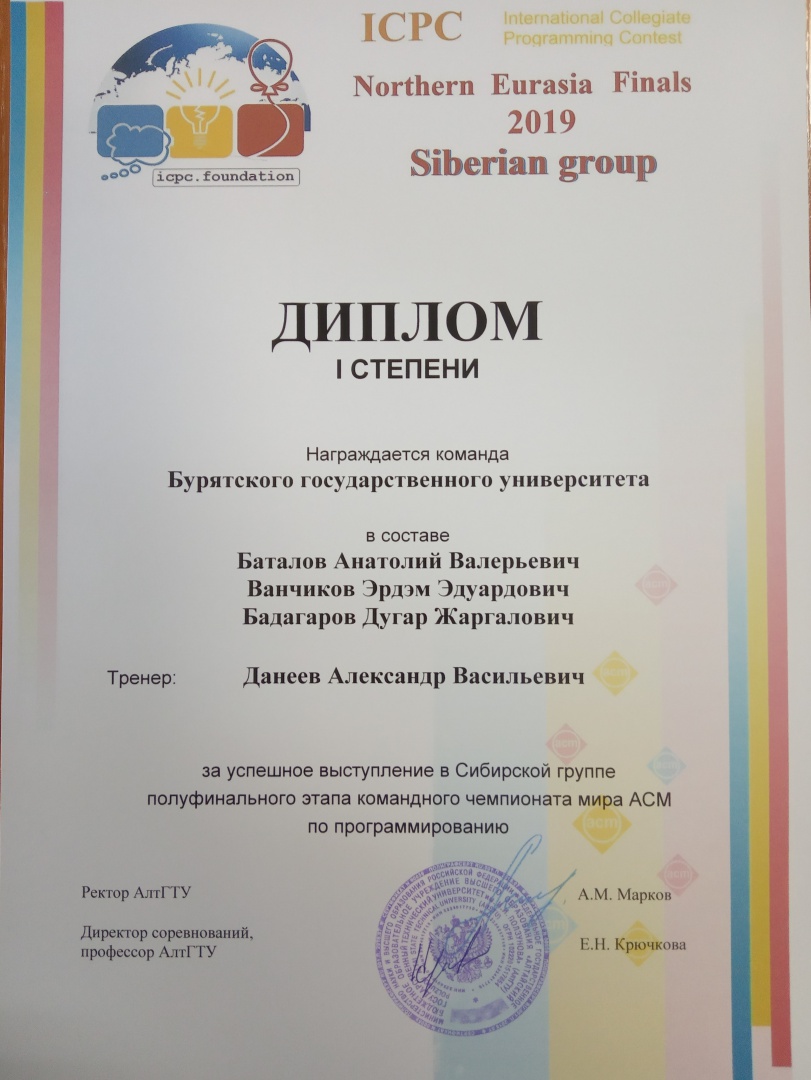 Коллектив преподавателей и студентов ИМИ поздравляет команду Buryat SU: 4 (Анатолий Баталов, Эрдэм Ванчиков, Дугар Бадагаров) и их бессменного тренера Александра Васильевича Данеева с успешным выступлением на международной студенческой олимпиаде по программированию ICPC 2019-2020, NERC - Northern Eurasia Finals. Студенты ИМИ соревновались со студентами-программистами Сибирской группы вузов в Алтайском государственном техническом университете им. Ползунова в Барнауле. В упорной борьбе, решив 5 задач, наши ребята завоевали диплом 1-й степени Сибирской группы и диплом 3-й степени финала Северной Евразии!