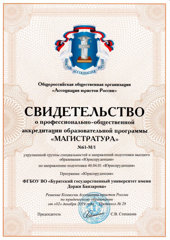 В соответствии с рекомендациями Экспертного центра Комиссия аккредитовала образовательные программы укрупненной группы направлений подготовки и специальностей «Юриспруденция», реализуемые в Бурятском госуниверситете!