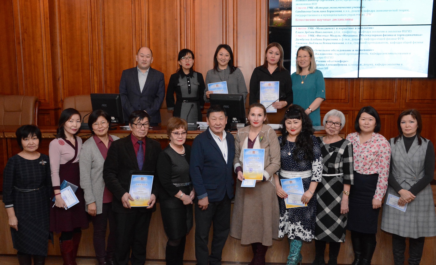Комиссия по подведению итогов конкурса (председатель – проректор по учебной работе БГУ А.Н.Макаров, члены комиссии: Э.Т.Павлова, к.х.н., доцент, начальник УМУ, М.В.Дармаев, к.т.н., доцент, начальник отдела методического обеспечения образовательной деятельности УМУ, А.К.Мордовской, к.физ.-мат.н., старший преподаватель кафедры алгебры, геометрии и методики преподавания математики ИМИ, О.А.Пестерева, доцент кафедры психологии детства ПИ, С.А.Юн-Хай, к.п.н., доцент, начальник отдела управления качеством УМУ) отметила активность отдельных преподавателей. Второй год принимают участие Санданова С.Б., к.э.н., доцент кафедры экономической теории и государственного и муниципального управления ИЭУ, Бадлеева М.В., к.мед.н., доцент кафедры инфекционных болезней МИ, Аюрова О.Ж., старший преподаватель кафедры землепользования и земельного кадастра, заместитель декана по учебной работе ФБГИЗ. Наиболее активными участниками явились преподаватели ФБГИЗ (было представлено 6 УМК). Также члены комиссии обратили внимание, что второй год не принимают участие преподаватели ФФКСИТ.