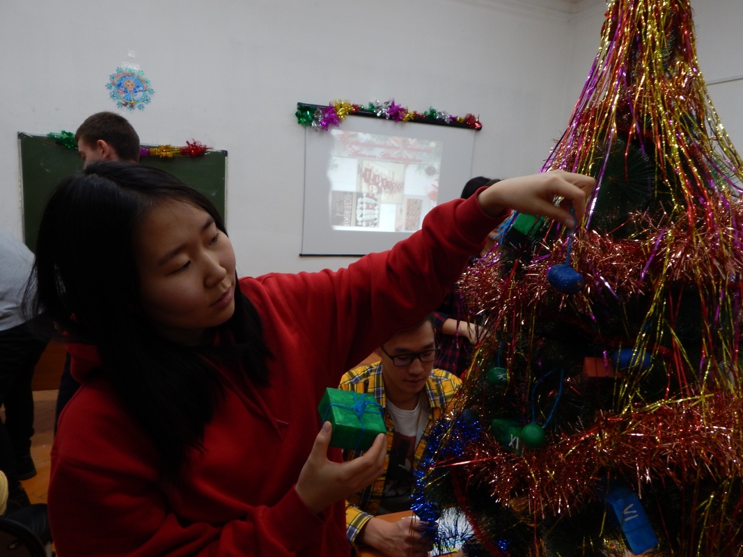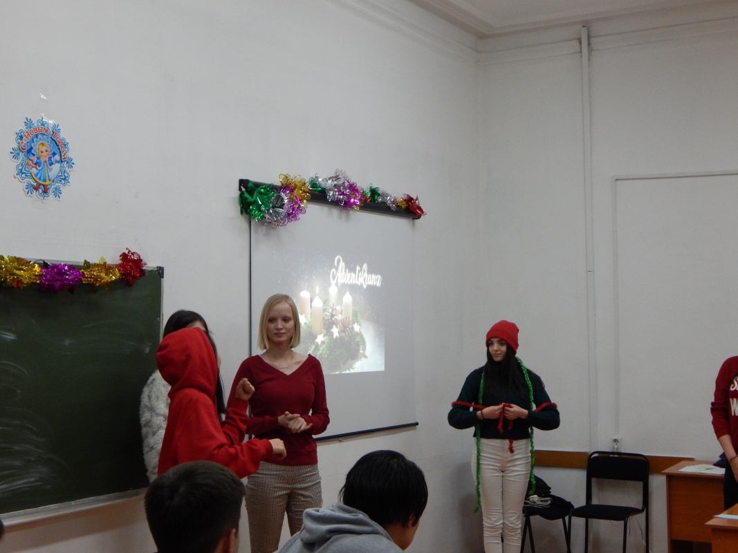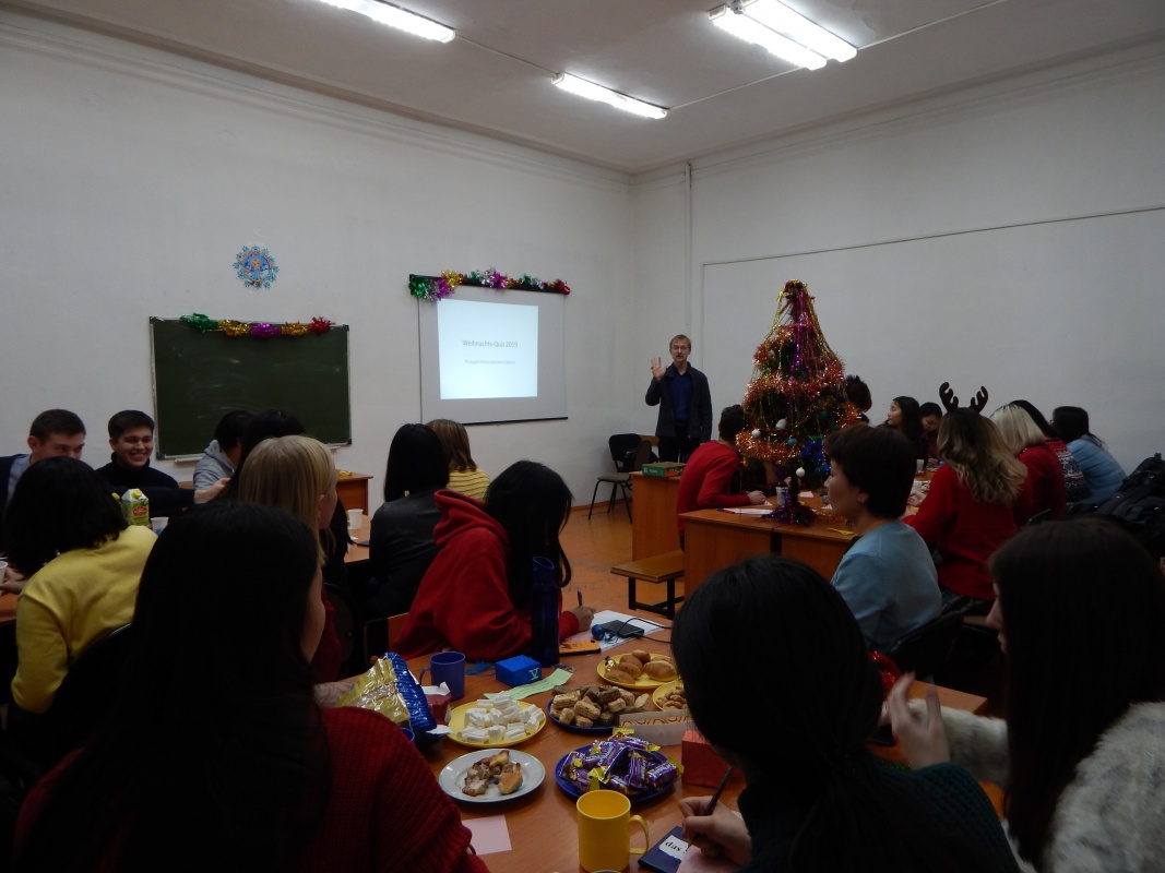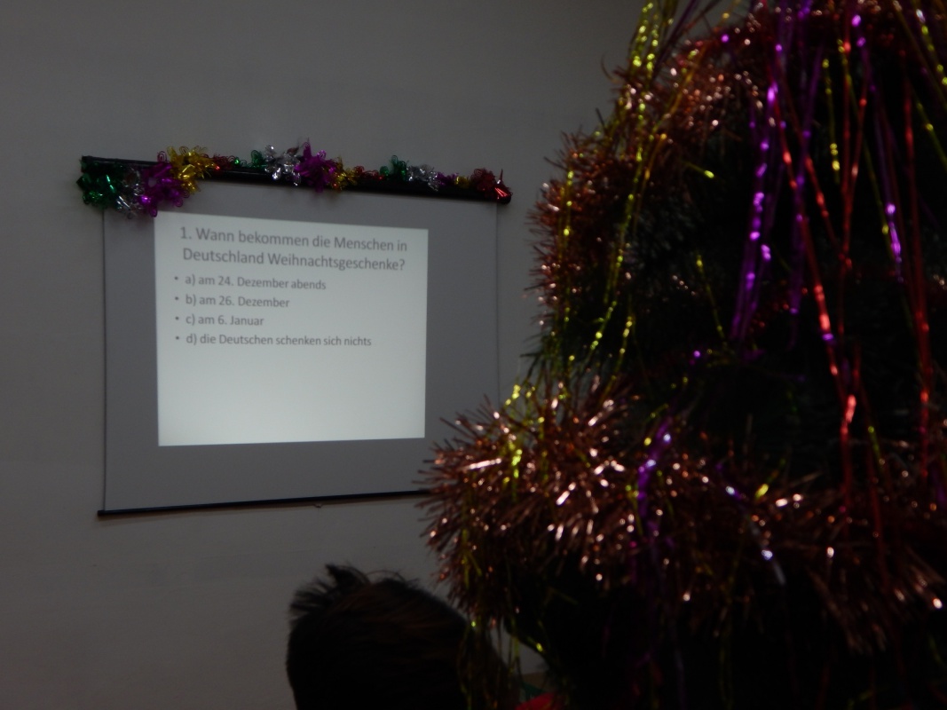 Не обошлось и без веселых конкурсов, подарков и шуточной викторины, на которой студенты узнали, например, чем отличается Дед Мороз и немецкий Санта-Клаус, и что в Германии, к сожалению, на Рождество не бывает снега, что Рождество всегда празднуется в семейном кругу, а главным блюдом считается запечённый гусь.