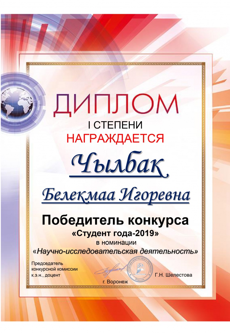 Студентка химического факультета Чылбак Белекмаа Игоревна приняла участие в конкурсе "Студент года" - 2019 при поддержке научно-практического журнала «Устойчивое развитие науки и образования».