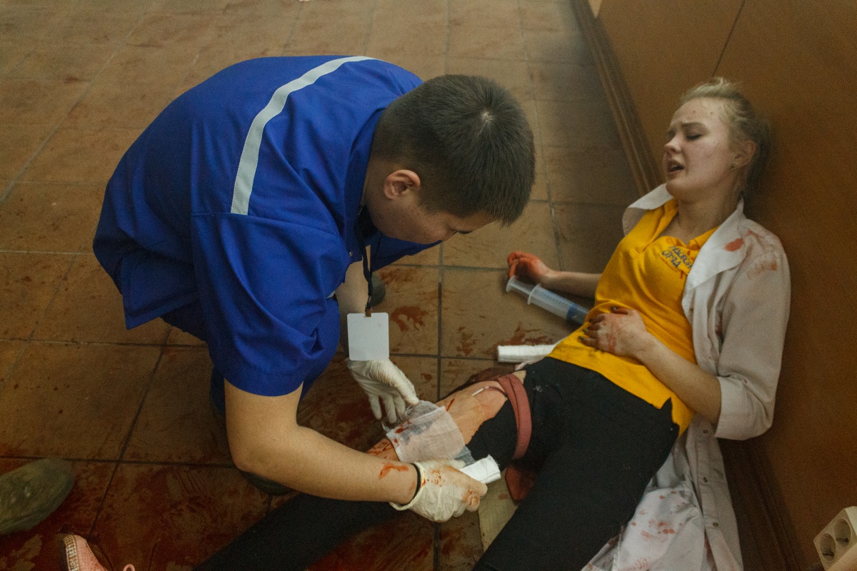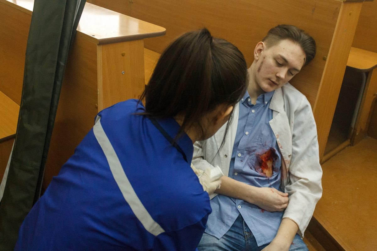 Для ребят было впечатлительно и ответственно оказание помощи нескольким пострадавшим при теракте с бомбой в лекционном зале. Достаточно сложная экстренная ситуация была организована профессиональными актёрами, сотрудниками Росгвардии, кинологами с обученными собаками.