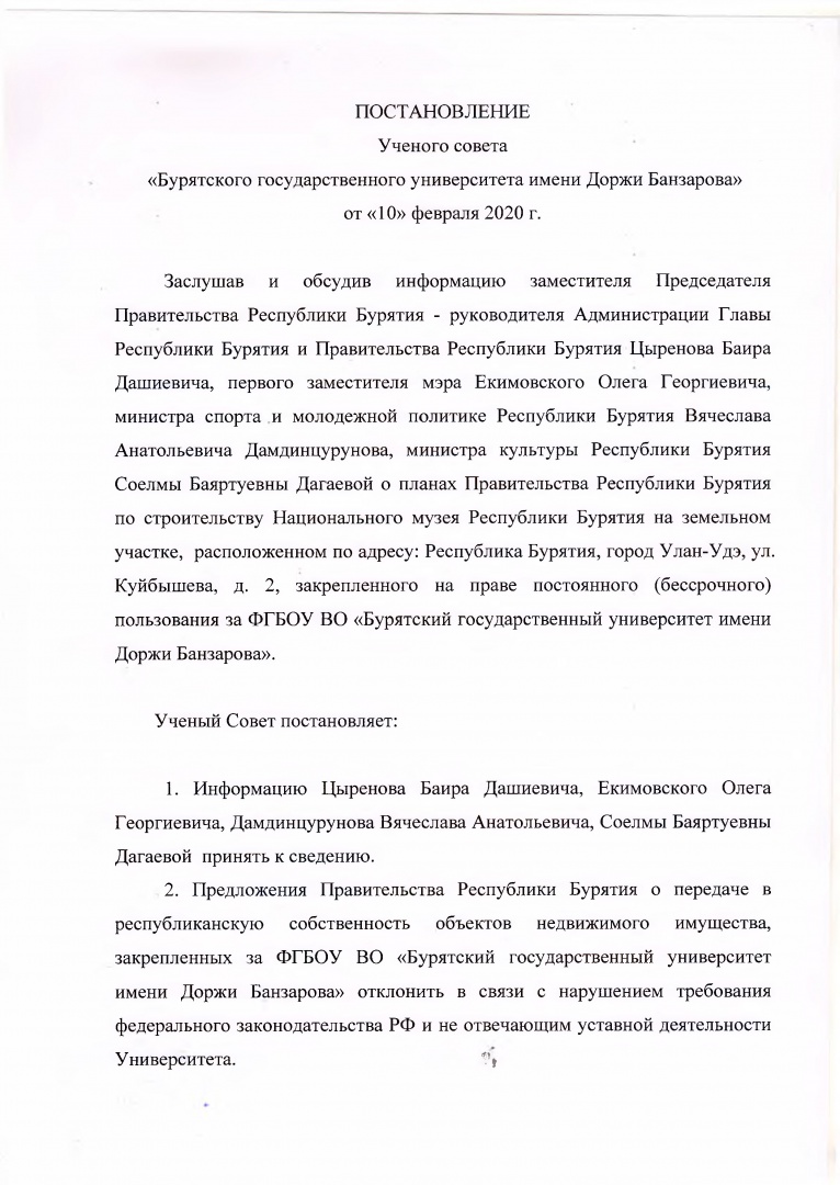 Итогом заседания стало Постановление Ученого Совета Бурятского государственного университета им. Доржи Банзарова от 10 февраля 2020 года.