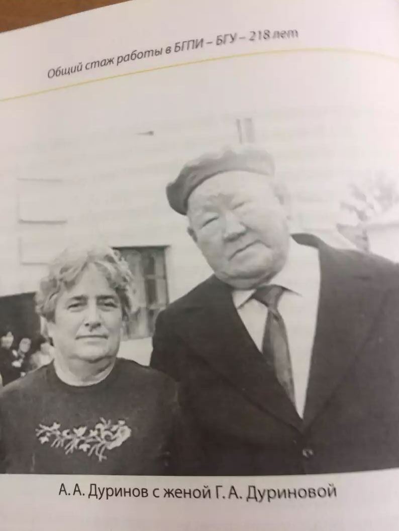 «В университете работала жена Алексея Алексеевича Галина Афанасьевна Дуринова, которая 1945 году окончила БГПИ и работала преподавателем кафедры педагогики. Вместе они воспитали трех сыновей, двое окончили физико-математический факультет института и работали в БГПИ. Аркадий Алексеевич 17 лет работал в БГПИ, Вячеслав Алексеевич кандидат экономических наук 2 года. Внучка Елена Вячеславовна Дуринова закончила факультет экономики и управления БГУ и работала в университете. Брат Иван Алексеевич Дуринов кандидат физико-математических наук, доцент в течении 10 лет был деканом физико-математического факультета, 49 лет работал в вузе. Сын Ивана Алексеевича Степан Иванович Дуринов кандидат физико-математических наук, доцент 37 лет проработал БГПИ-БГУ, дважды избирался заведующим кафедрой теоретической физики, был глубокий, тонко чувствующий человек, обладал феноменальной памятью, свободно цитировал восточных и западных философов, особенно Сенеку. Светлана Батуевна Дуринова кандидат филологических наук, доцент –жена Степана Ивановича 23 года работала в вузе старшим преподавателем на кафедре русской и зарубежной литературы филологического факультета БГУ. Младший брат Степан Алексеевич Дуринов в 1939 году закончил Казанский государственный университет, служил в армии, в годы Великой Отечественной войны командовал партизанским отрядом в Смоленской области, был в плену, прошел все проверки. В 1946 году начал работать преподавателем зоологии в БГПИ.