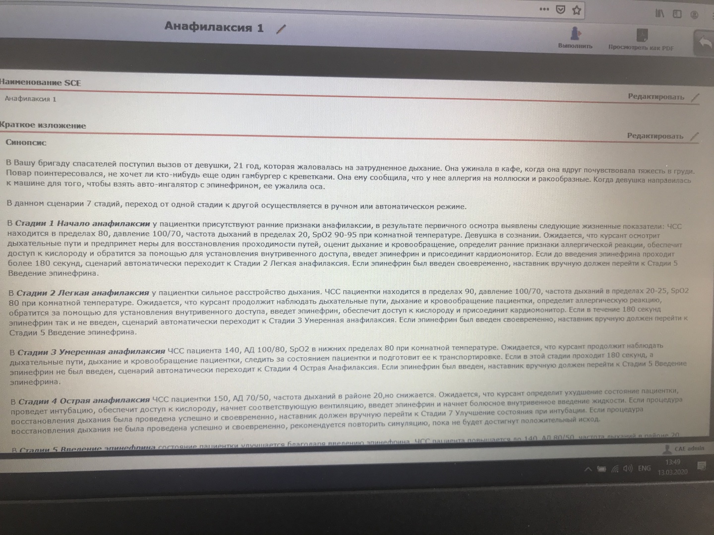 Пример: преподаватели распознали клинические проявления анафилактического шока, начали мониторинг физиологических параметров, интерпретировали показатели монитора ЭКГ (12 отведений).