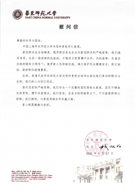 Бурятский государственный университет получил письмо от ректора Восточно-Китайского Педагогического университета Цянь Сюй Хун со словами поддержки и пожеланиями успехов в борьбе с эпидемией, здоровья и благополучия.