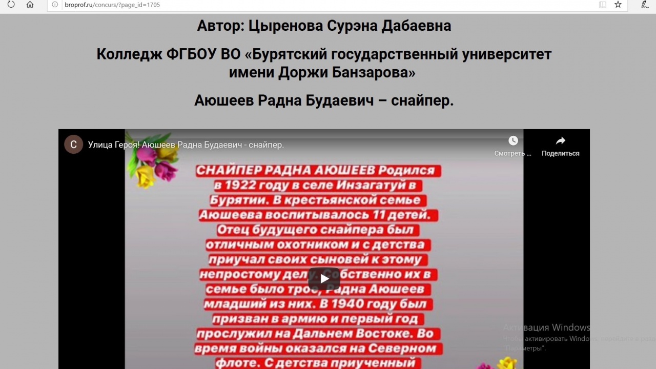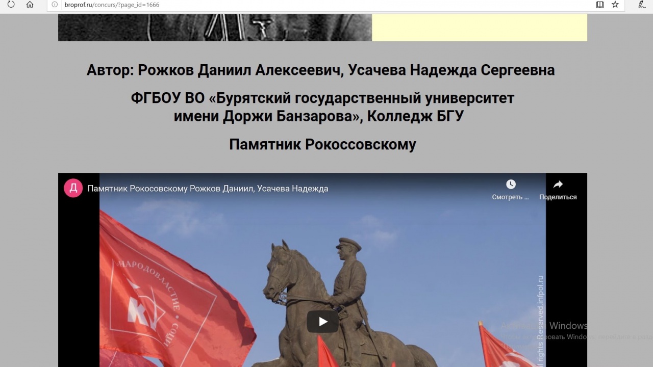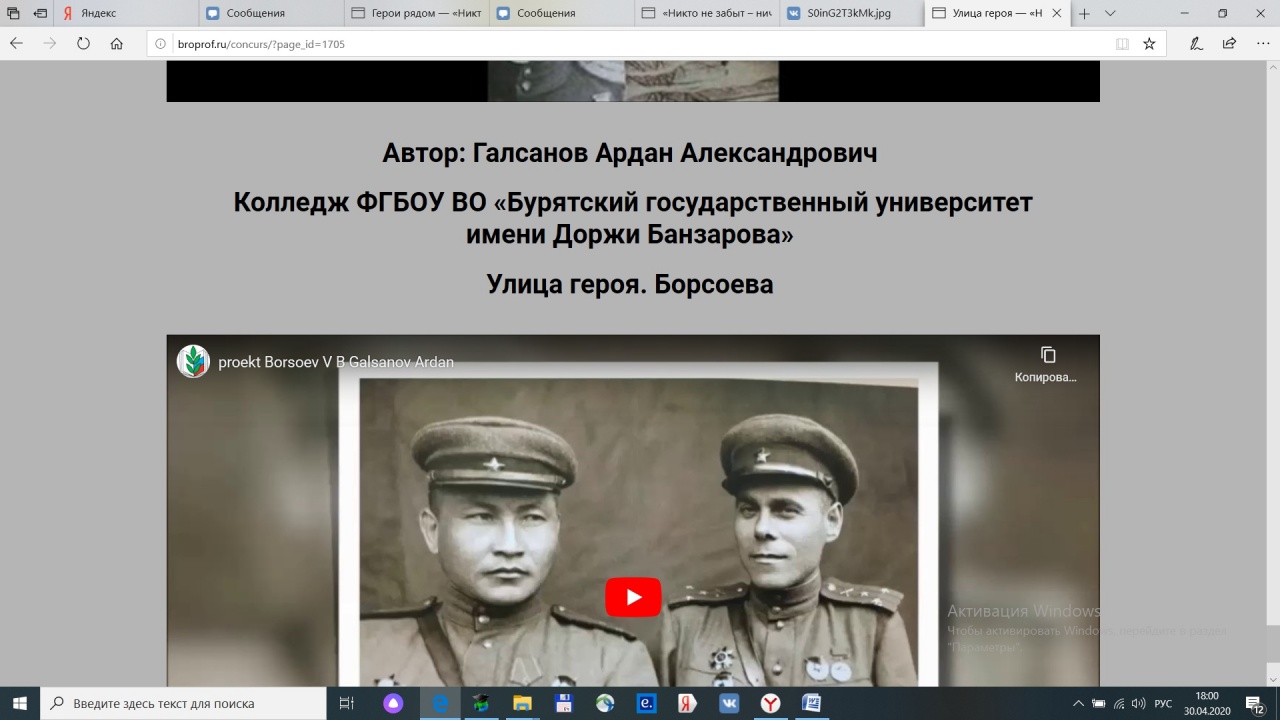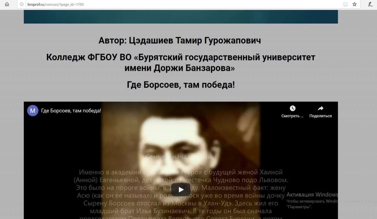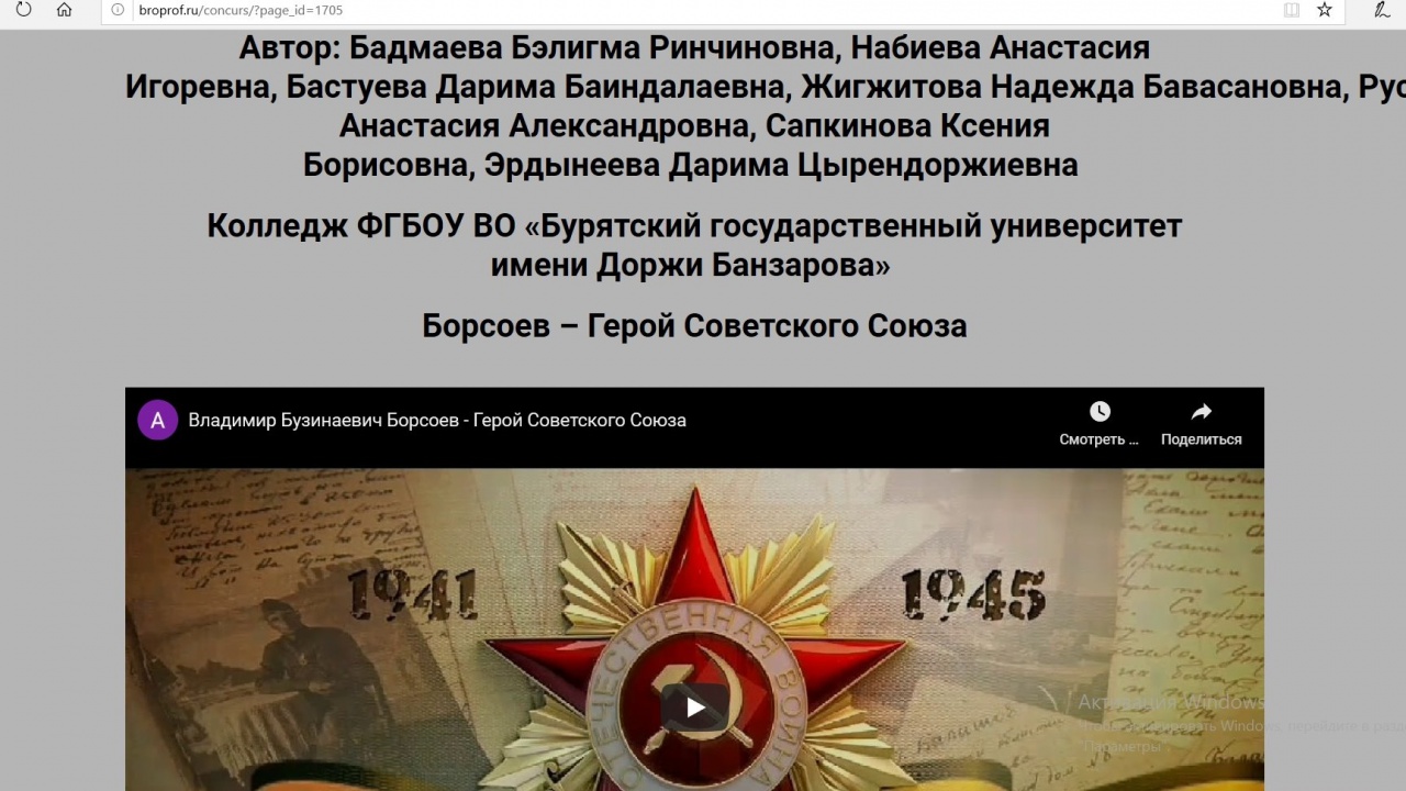 Около 15 студентов Колледжа БГУ принимают участие в республиканском конкурсе: "Никто не забыт, ничто не забыто", посвященного 75-летию Победы в Великой Отечественной войне 1941–1945 гг. Конкурс призван содействовать сохранению и укреплению памяти о событиях Великой Отечественной войны, воспитанию уважения к ветеранам войны и защитникам Отечества. Подготовлены видеосюжеты по номинациям "Памятник герою", "Улица героя", "Герои рядом". Организатором Конкурса является Бурятская республиканская организация Профсоюза работников народного образования и науки РФ.