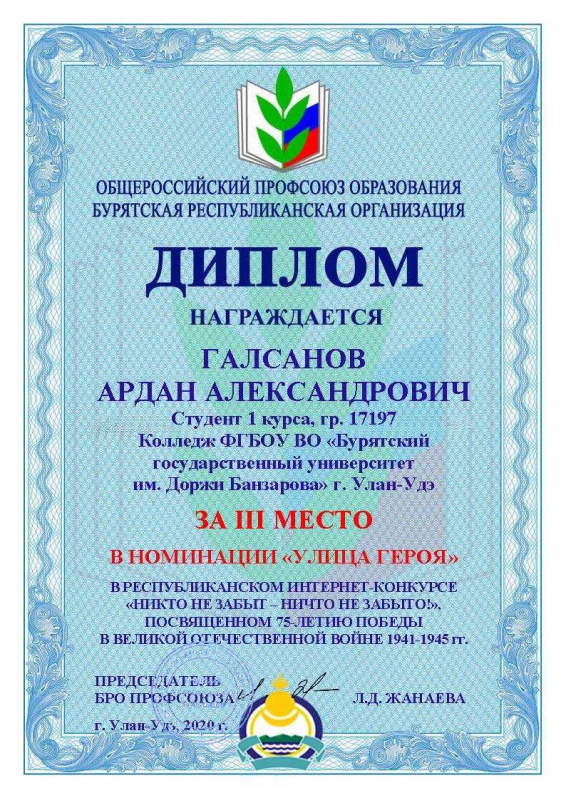 Цель Конкурса: повышение патриотического духа, чувства гражданского достоинства, любви к Отечеству и родному краю, сохранение преемственности поколений путем привлечения внимания общественности к вопросам изучения истории, укрепления памяти о событиях Великой Отечественной войны, пропаганда уважительного отношения к ветеранам войны и защитникам Отечества. Всего была принята 81 заявка. Поздравляем Галсанова Ардана, студента Колледжа БГУ гр. 17197, занявшего 3 место в номинации «Улица героя».