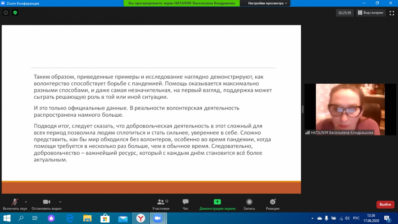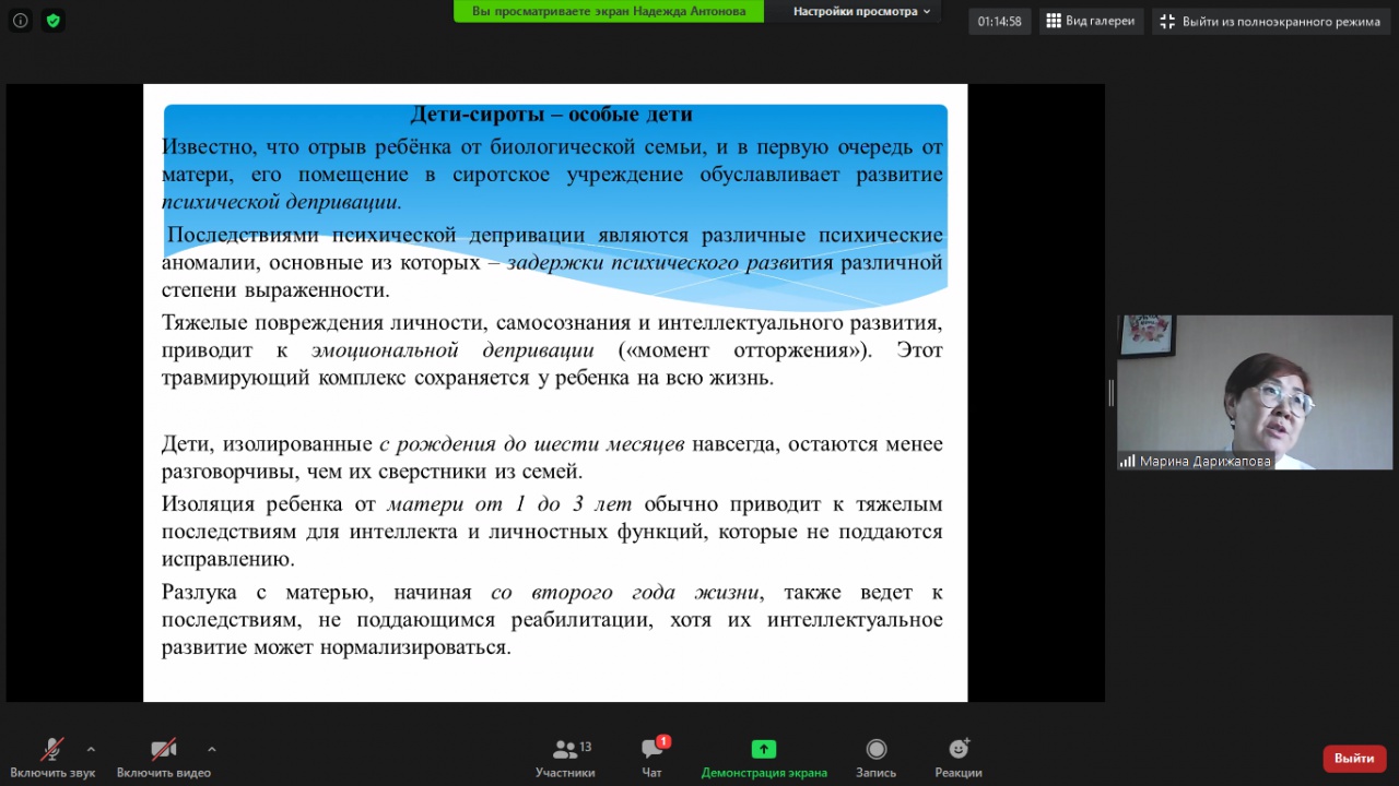 С пленарными докладами выступили З. А. Бутуева, канд. филос. наук, заместитель декана СПФ по учебной работе «Организация интерактивных площадок «Планета поколений» в сельских поселениях Республики Бурятия», М. П. Рогачева, директор Детского дома-интерната "Журавушка" «Организация деятельности ГБУСО РБ «Детский дом для детей с серьезными нарушениями в интеллектуальном развитии «Журавушка» в условиях режима работы «тотальная» изоляция», О. И. Сахарова, старший воспитатель Бичурского центра помощи детям, оставшимся без попечения родителей «Особенности адаптации детей, поступающих в учреждение социального обслуживания» (на примере ГБУСО «Бичурский центр помощи детям, оставшимся без попечения родителей»)», М. Н. Дарижапова, канд. психол. наук, доцент кафедры общей и социальной психологии СПФ «Особенности психологии детей-сирот», А. М. Бадонов, канд. соц. наук, доцент кафедры теории социальной работы СПФ «Насилие в семье как фактор развития социального сиротства», Н. В. Кондрашова, канд. соц. наук, доцент кафедры теории социальной работы СПФ «Волонтёрство как ресурс социальной работы в период ограничительных мероприятий (на примере Республики Бурятия)».