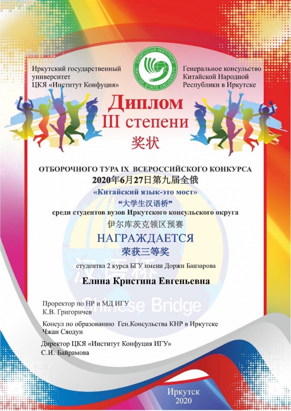 Центр китайского языка «Институт Конфуция ИГУ» при поддержке Генерального Консульства КНР успешно провел региональный отборочный этап IX Всемирного конкурса по китайскому языку среди учащихся высших учебных заведений Сибирского федерального округа. Конкурс 汉语桥 «Китайский язык – это мост» организуют и проводят в разных странах мира Институты Конфуция совместно с Посольствами и Генконсульствами Китайской Народной Республики.